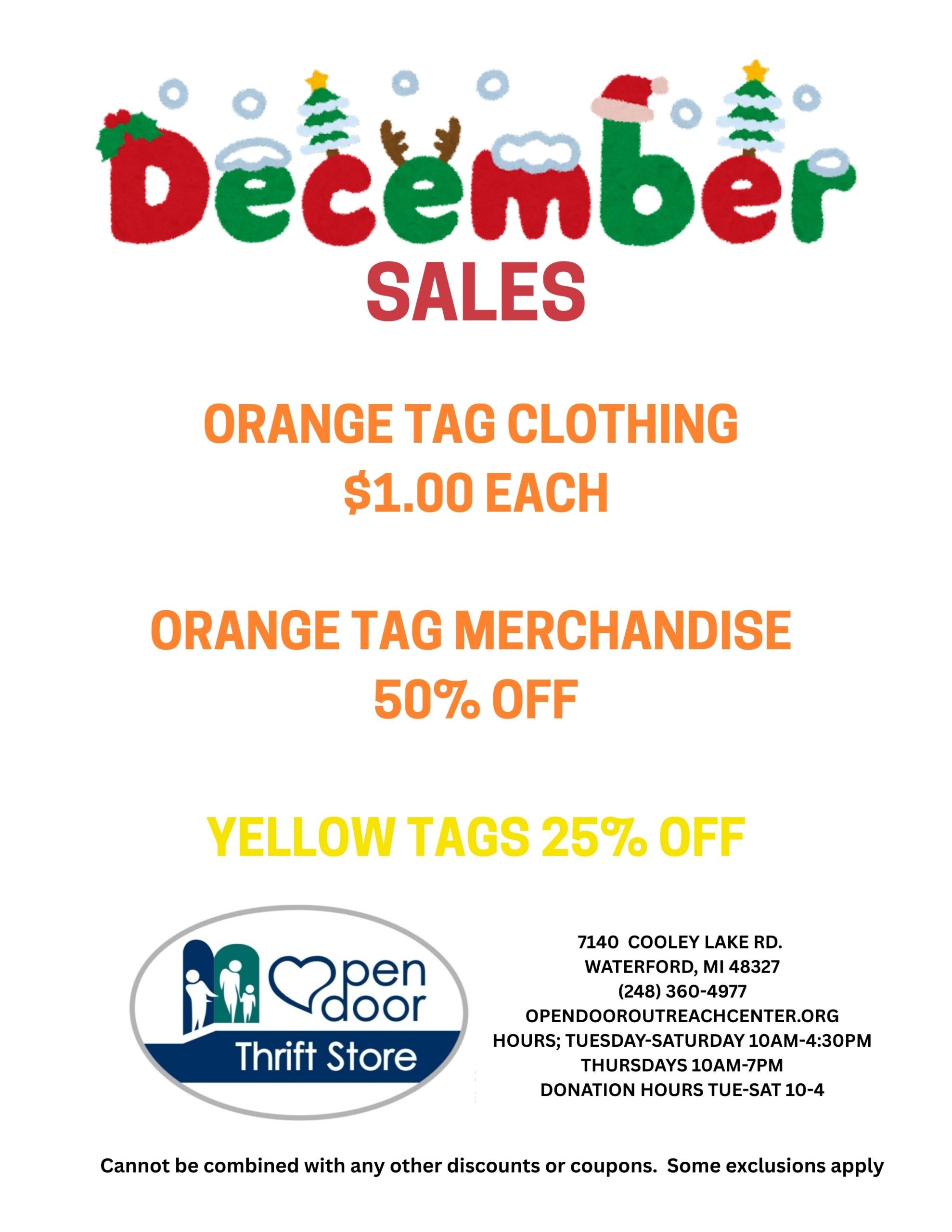 Open Door Thrift Store CLOSES on all major holidays, we also close when the Waterford School District closes, to keep our volunteers safe from inclement weather, please check our public facebook page for updates.